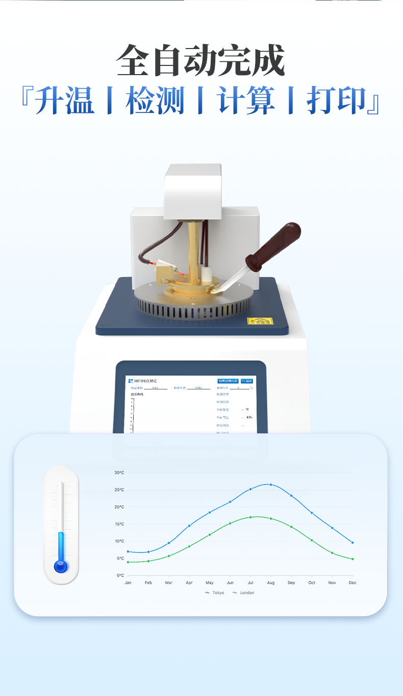 仪器按照GB/T 261-2021方法规定的升温曲线加热,温度接近预期闪点值时自动点火,当出现闪点时仪器自动锁定结果,并显示和打印,同时启动风机自动对加热器进行冷却。