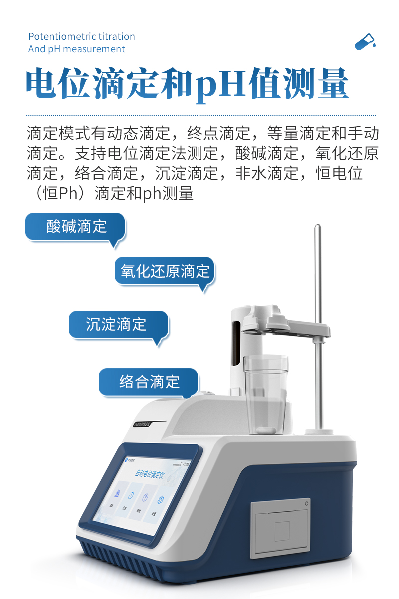 1、设备支持电位滴定和pH值测量;用户选择不同电极可进行酸碱滴定、氧化还原滴定、沉淀滴定、络合滴定等多种滴定和pH测量;