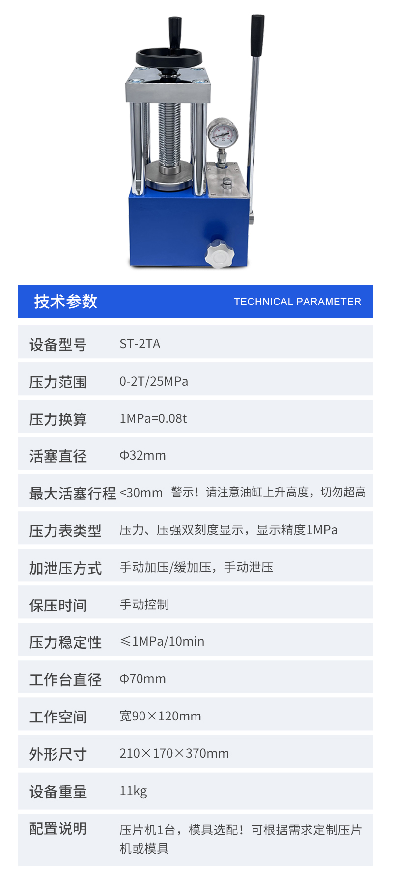 配置说明压片机1台,模具选配,数显表选配!可根据需求定制压片机或模具