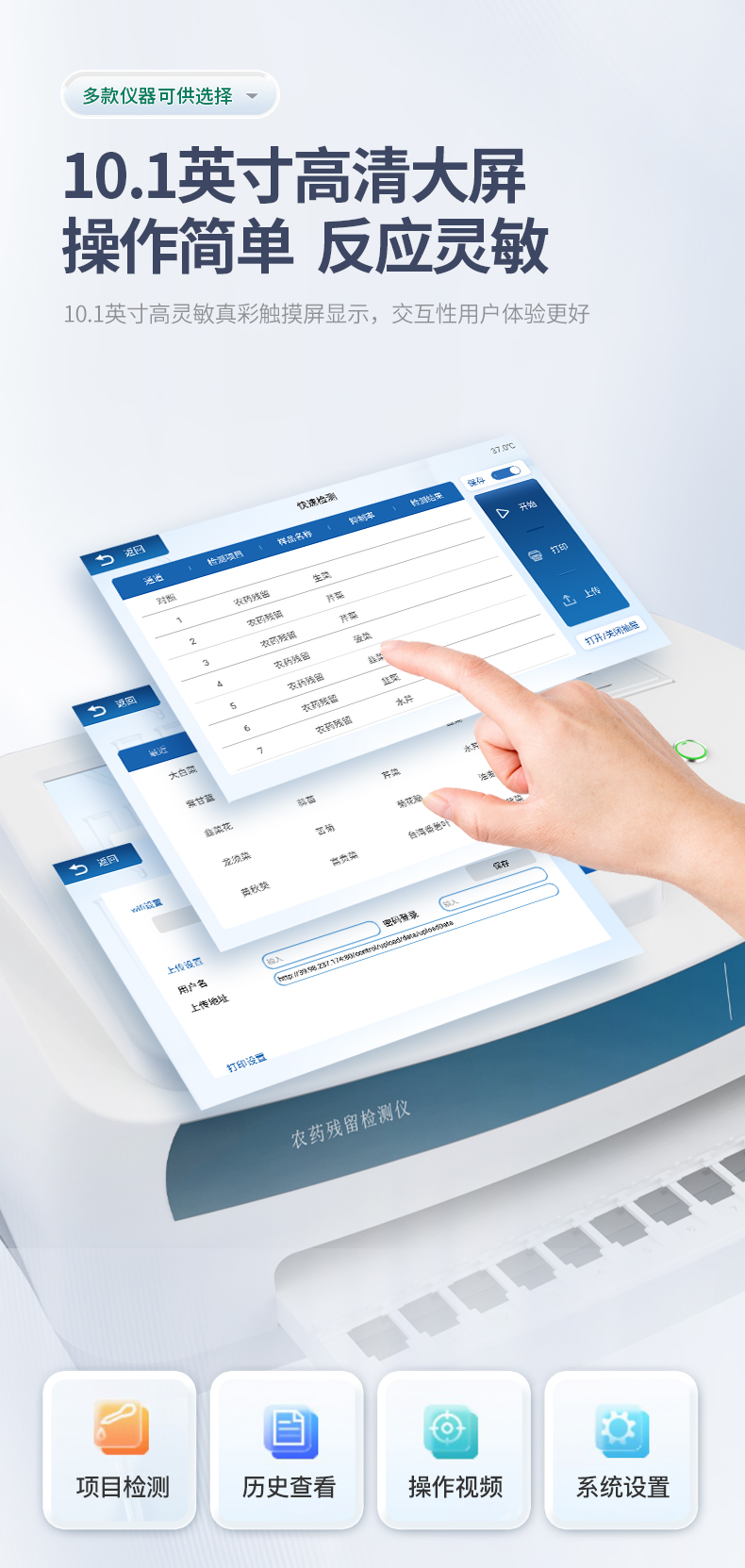 采用酶抑制率比色法对蔬菜、水果、茶叶、粮食、农副产品等食品中有机磷和氨基甲酸酯类农药残留含量进行快速准确的检测;广泛应用于果蔬茶生产基地和农贸批发销售市场现场检测、农业部门、学校食堂、市场监管局、检测中心等的安全速测。