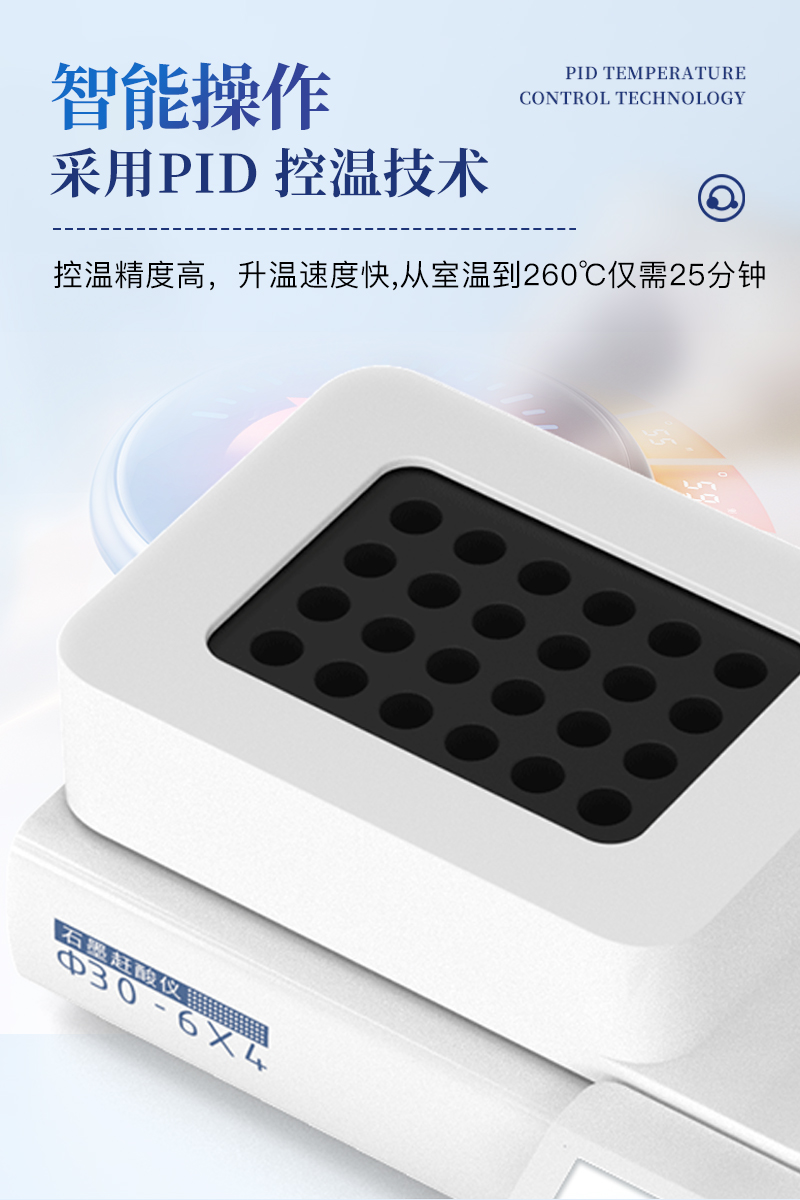 采用PID 控温技术,控温精度高,升温速度快, 从室温到260℃仅需25分钟。