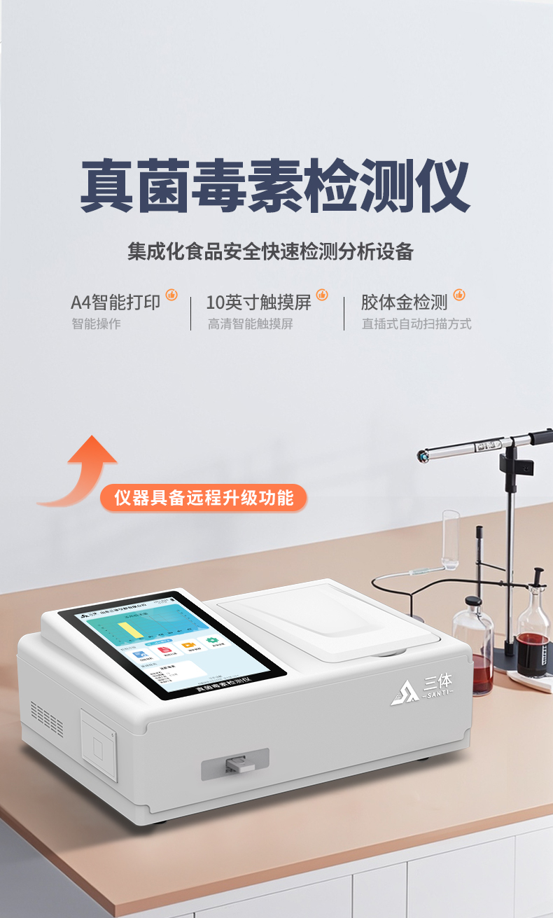山东三体仪器有限公司生产的真菌毒素检测仪应用竞争抑制免疫层析的技术原理,通过就是通过待检测物与抗体结合的方法,分析待检样品中真菌毒素残留??煽焖偌觳饬甘?、饲料、谷物、食用油、调味品中如玉米、大米、小麦、大麦、糙米、麸皮、稻谷、豆粕、米糠、饲料中的黄曲霉毒素B1、M1、总量,玉米赤霉烯酮、呕吐毒素、T2毒素、赭曲霉毒素、伏马毒素等。