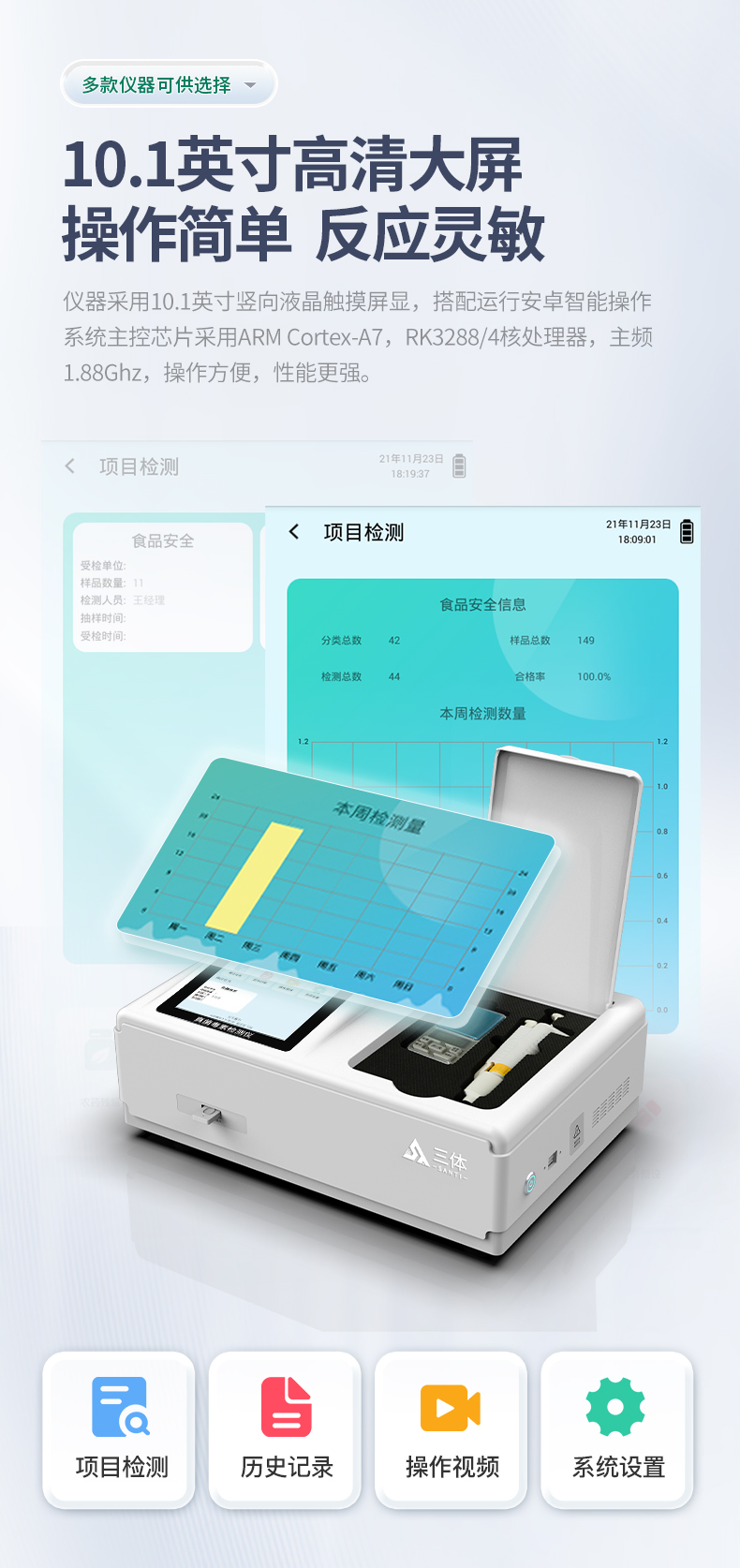 1、仪器采用10.1英寸液晶触摸屏显,搭配运行安卓智能操作系统,主控芯片采用ARM Cortex-A7,RK3288/4核处理器,主频1.88Ghz,运转速度更快速,性能更强。