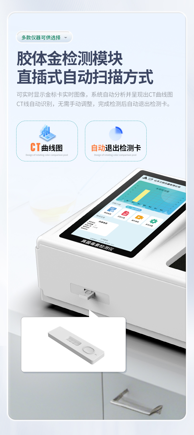 直插式自动扫描方式,可实时显示金标卡实时图像,系统自动分析并呈现出CT曲线图,CT线自动识别,无需手动调整,完成检测后自动退出检测卡。