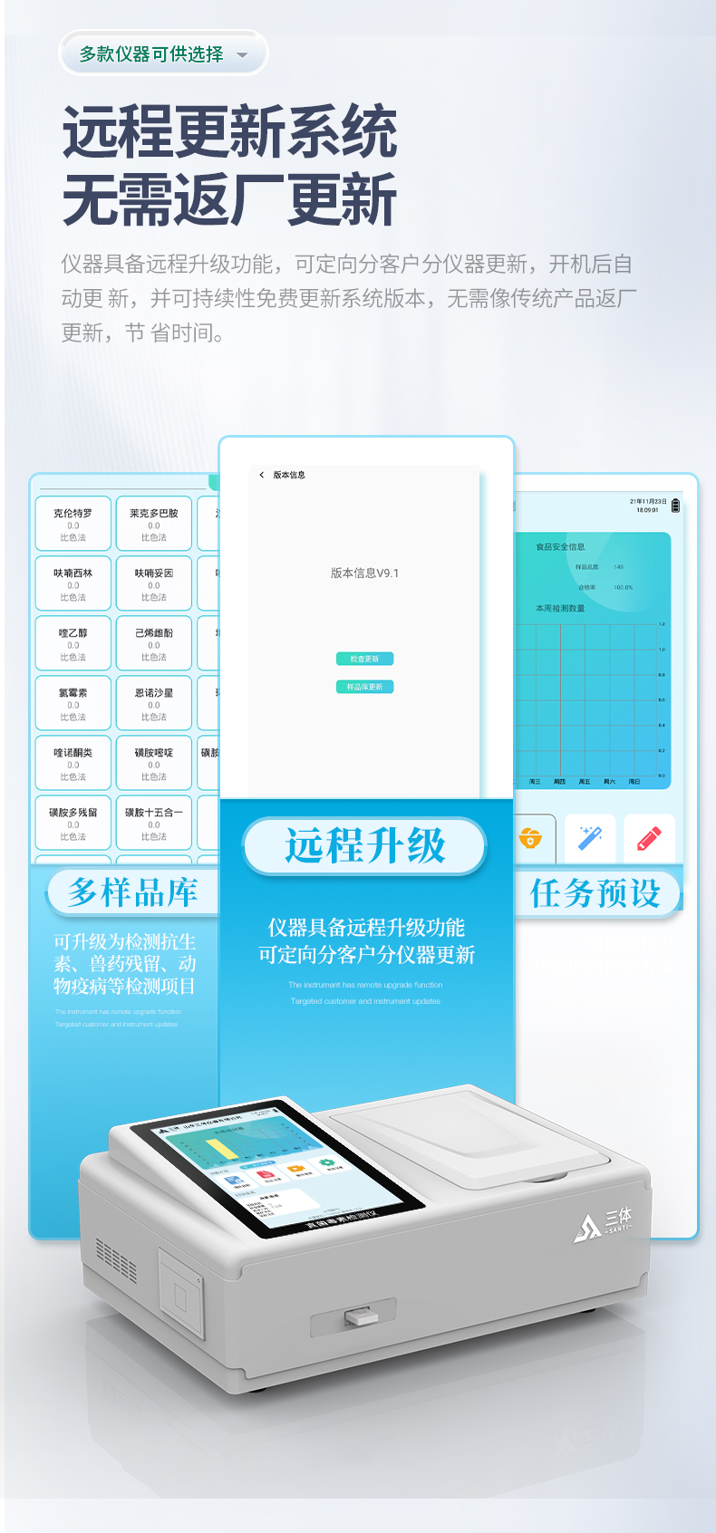 13、仪器具备远程升级功能,可定向分客户分仪器更新,开机后自动更新,并可持续性免费更新系统版本,无需像传统产品返厂更新,节省时间及人力成本并避免了物流运输返厂升级导致设备损坏的潜在风险。