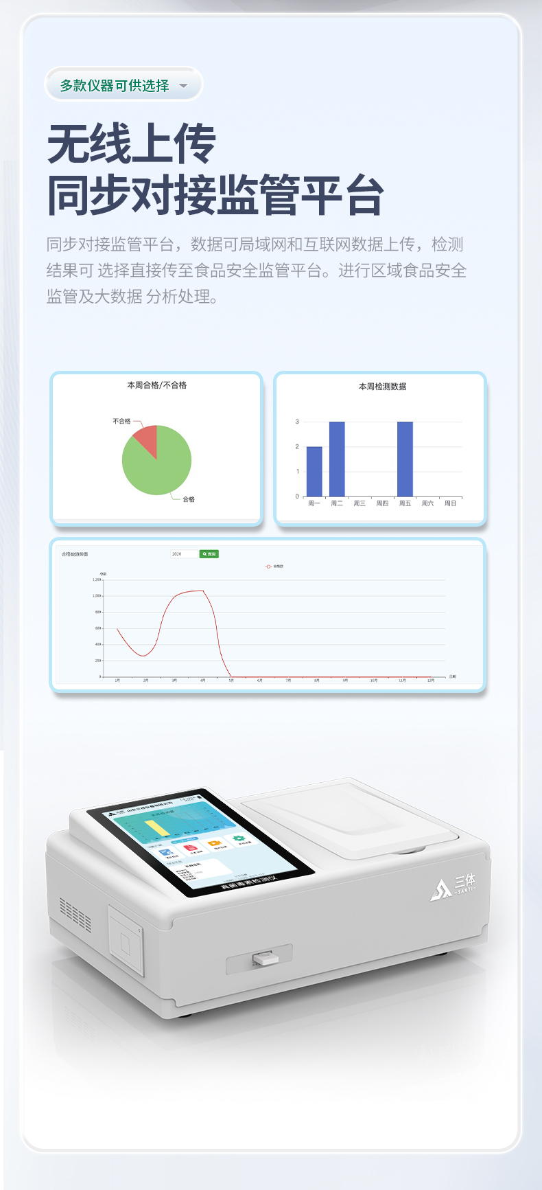 11、仪器具有 wifi 联网上传、RJ45网线连接功能,可以快速上传数据。同步对接监管平台,数据可局域网和互联网数据上传,检测结果直接传至食品安全监管平台。进行区域食品安全监管及大数据分析处理与数据统计,检测区域食品安全长短期动态,达到食品安全问题预估、预警。