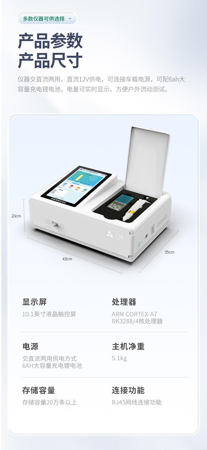 3.一体化台式快检设备,采用交直流两用供电方式,可连接车载电源,配备6ah大容量充电锂电池,可以满足现场及流动检测使用的需求。仪器尺寸:43×35×20cm, 主机净重:5.1kg
